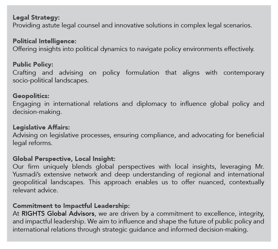 RIGHTS Global Advisors, under the leadership of the esteemed Mr. Yusmadi, stands as a beacon of excellence in the fields of legal strategy, political intelligence, public policy, geopolitics, and legislative affairs. Our firm is dedicated to providing top-tier advisory services, grounded in Mr. Yusmadi’s profound expertise and diverse experience, to lead in Malaysia and extend its influence regionally and globally.